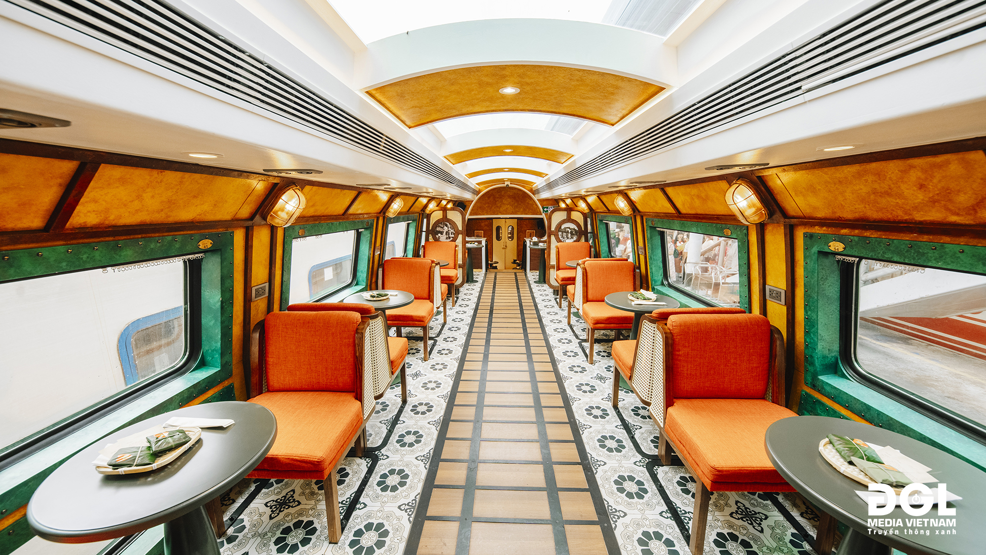 Rời khỏi miền ký ức ấy, toa Ô Quan Chưởng và Ô Cầu Giấy lại mở ra một bức tranh trữ tình mà hào hùng. Hình ảnh cầu Long Biên - chứng nhân lịch sử - được lồng ghép khéo léo trên trần nhà, khung cửa, lưng ghế. Họa tiết sóng sông Hồng uốn lượn như nhịp thở của một thành phố không bao giờ ngơi nghỉ.
